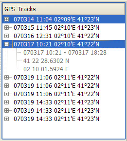 När GPS-data har importerats fylls tabellen i GPS data-fliken med data för varje enskild GPS-logg. Genom att klicka på plustecknet vid varje logg så kan man få upp mer detaljer. Stora GPS-filer kan ta ganska lång tid att ladda.